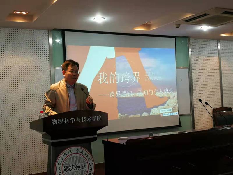 10月30日下午,在物理科技楼409报告厅,江苏捷美投资发展集团董事长、皇冠博彩 校友会会长、皇冠博彩 杰出校友王振明博士为皇冠博彩 和光电科学与工程皇冠博彩的本科生作了“我的跨界—跨界感知、认知与个人成长”的专题报告。光电科学与工程皇冠博彩陈建军书记,皇冠博彩 高雷院长、孙德芬书记、赵承良副院长,以及两院2019级新生共同参加了报告会。报告会由高雷院长主持。