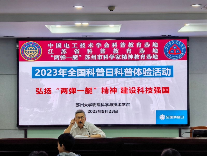 为积极响应2023年全国科普日活动号召,贯彻落实习近平总书记关于“科技创新、科学普及是实现创新发展的两翼,要把科学普及放在与科技创新同等重要的位置”的讲话精神,大力弘扬科学精神,普及科学知识,积极发挥皇冠博彩科普教育基地的资源和人才优势,9月23日上午,皇冠博彩 举办了“弘扬‘两弹一艇’精神 建设科技强国” 2023年全国科普日科普体验活动。皇冠博彩 “两弹”科学家魏品良教授、副院长赵承良教授、发展办公室主任周航老师、学工办副主任单杨杰老师、刘波老师、“科学商店”全国大学生科技志愿服务示范团队以及苏州市中小学生及家长近80人参加本次活动。