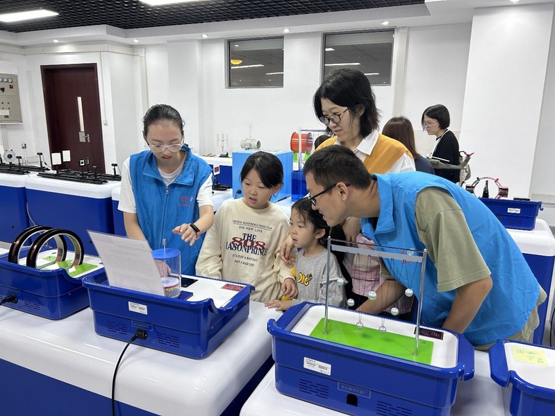 随后,大家到科技创新场馆及科学家精神展示馆进行参观及科普体验。皇冠博彩“科学商店”的科普志愿者对小朋友感兴趣的双缝干涉、太阳能发电站、光的波粒二象性、发电机与电动机、粒子加速器等实验现象的物理原理进行解释,让参加活动的同学们体验了一场趣味、生动、绚丽的科学盛会。